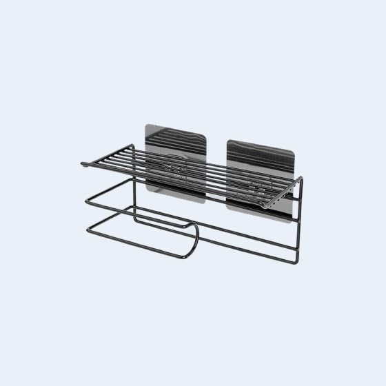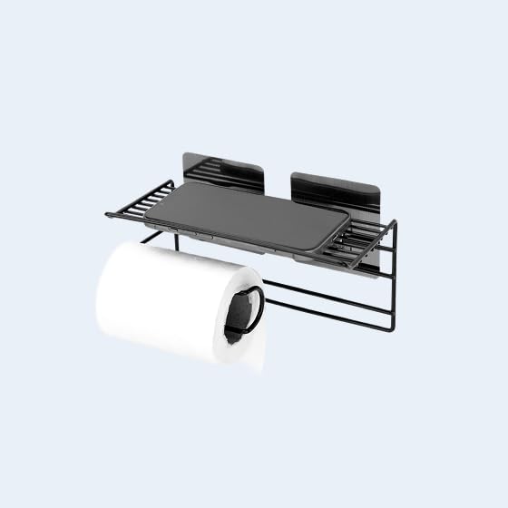 - VERSATILE DESIGN: Wall-mounted bathroom organizer combines toilet paper holder with a convenient phone shelf and storage rack in sleek black iron construction